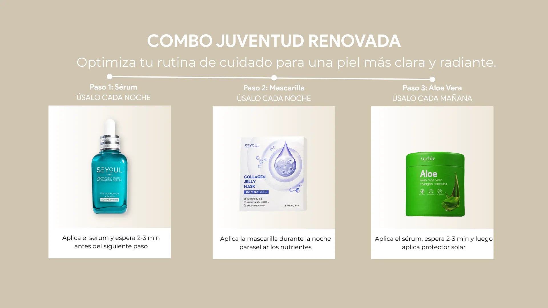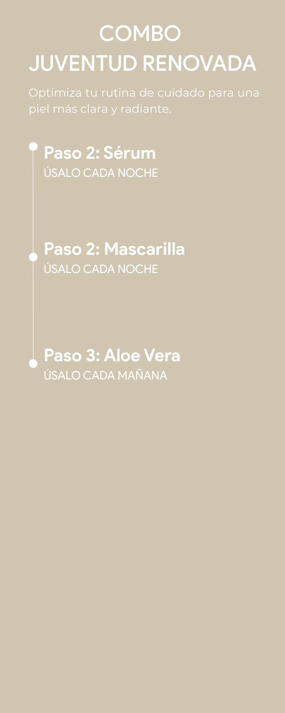 El combo ya incluye los pasos esenciales para un cuidado antiedad completo. Sin embargo, se recomienda aplicar protector solar durante el día para maximizar los resultados.